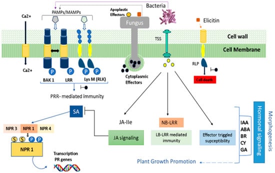 Plant/pathogen interaction involves several metabolic pathways that are implicated in plant immunity to harmful agents. Among these pathways, microbe- or pathogen-associated molecular patterns (MAMPs/PAMPs) are transmitted by pathogen agents to the apoplast as apoplastic effectors, or inside host cells as cytoplasmic effectors, to disrupt plant cell metabolism. MAMPs can be sensed via cell surface receptor proteins (RLPs) or pattern recognition receptors (PRRs; receptor kinases (RLKs) and trigger downstream phosphorylation cascades and cause elevated concentrations of [Ca2+] and reactive oxygen species (ROS). Pathogenic effectors are recognized by intracellular receptors, nucleotide-leucine-rich-repeat binding sites (NLRs or NB-LRRs), triggering downstream responses, notably the accumulation of SA. Modulation of gene expression, protein synthesis (PR), and the formation of antimicrobial metabolites are all effects of defense signaling.