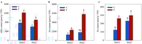 Response of the ABA, SA and JA levels to freezing stress in the young wheat ears at the ACFP. Note: (A–C) Contents of abscisic acid (ABA), salicylic acid (SA), jasmonic acid (JA). C and F indicate the control and freezing treatments, respectively. JM22 and XM33 represent the freezing-tolerant and freezing-sensitive winter wheat varieties Jimai22 and Xumai33, respectively. Each value is the mean ± SE of three biological replicates. The different lowercase letters indicate statistically significant differences at the p < 0.05 level.