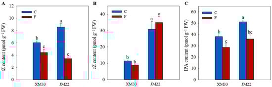 Response of the levels of cytokinin to freezing stress in the young wheat ears at the ACFP. Note: (A–C) Contents of trans-zeatin (tZ), cis-zeatin (cZ) and N6-isopentenyladenosine (IPA). C and F indicate the control and freezing treatments, respectively. JM22 and XM33 represent the freezing-tolerant and freezing-sensitive winter wheat varieties Jimai22 and Xumai33, respectively. Each value is the mean ± SE of three biological replicates. The different lowercase letters indicate statistically significant differences at the p < 0.05 level.