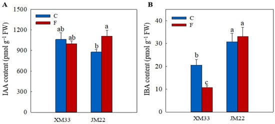 Response of the auxin levels to freezing stress in the young wheat ears at the ACFP. Note: (A,B) Contents of indoleacetic acid (IAA), indolebutyric acid (IBA). C and F indicate the control and freezing treatments, respectively. JM22 and XM33 represent the freezing-tolerant and freezing-sensitive winter wheat varieties Jimai22 and Xumai33, respectively. Each value is the mean ± SE of three biological replicates. The different lowercase letters indicate statistically significant differences at the p < 0.05 level.