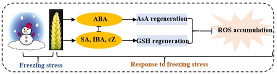 The results in this study indicated that the metabolism of the AsA–GSH cycle was involved in alleviating freezing-caused oxidative damage in young wheat ears at the ACFP. Compared to AsA, the regeneration and utilization of GSH were more important for maintaining redox homeostasis in young wheat ears under freezing stress. The hormones of SA, IBA and cZ may play a positive role in regulating the regeneration of GSH, and ABA may be implicated in controlling the regeneration of AsA in young wheat ears under freezing stress (Figure 9). However, the specific regulatory role of the various hormones in the response of young wheat ears to freezing stress and the synergistic mechanism between them need to be studied further.