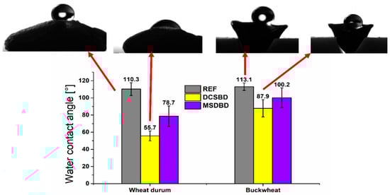 Effect of NTP treatment with DCSBD and MSDBD on the WCA measured on durum wheat grains and buckwheat achenes at optimal treatment times (buckwheat: DCSBD = 10 s, MSDBD = 5 s; durum wheat: DCSBD = 20 s, MSDBD = 30 s). The droplet images are assigned to resulting WCA values in graphs using arrows.