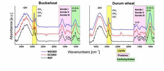 ATR-FTIR spectra of buckwheat and wheat durum before (control sample) and after plasma treatment with DCSBD and MSDBD in ambient air at optimal treatment times (buckwheat: DCSBD = 10 s, MSDBD = 5 s; durum wheat: DCSBD = 20 s, MSDBD = 30 s). Peaks of characteristic functional groups are marked by numbers above the peak (assignment of numbers is in Table 1). The * at the number in spectrum of durum wheat marks the extra functional groups present only in this spectrum (to preserve the same numbering in both spectra).