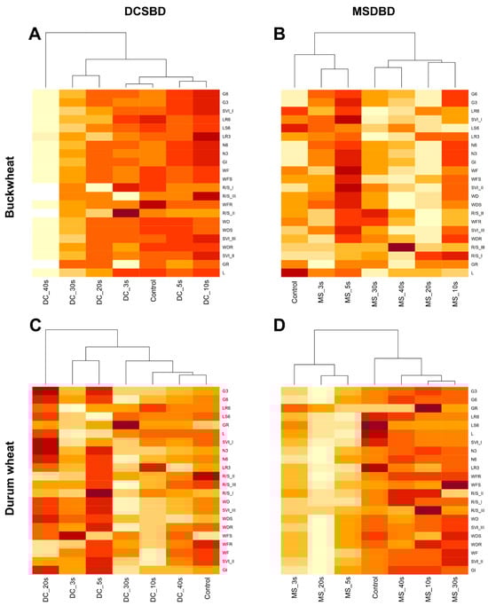 According to heatmap correlations, two different clusters were formed between the treatments (Figure 3); in the MSDBD plasma treatment (buckwheat and durum wheat) and in durum wheat treated with DCSBD plasma, the structures of the generated branches are the same, but they always contain different treatment times (Figure 3B–D). For buckwheat treated with DCSBD plasma, one treatment cluster is 40 s and the other cluster consists of all other treatment times (Figure 3A). For buckwheat treated with DCSBD plasma and durum wheat treated with MSDBD plasma, responses to shorter treatment times (including 0 s as a control) are always in one cluster and responses to higher times are in the second cluster (Figure 3B,C). For durum wheat treated with MSDBD plasma, the longer times including the response of the control set are in the first cluster (0 s, 30 s, 40 s) and the lower treatment times are in the second cluster (3 s–20 s; Figure 3D).