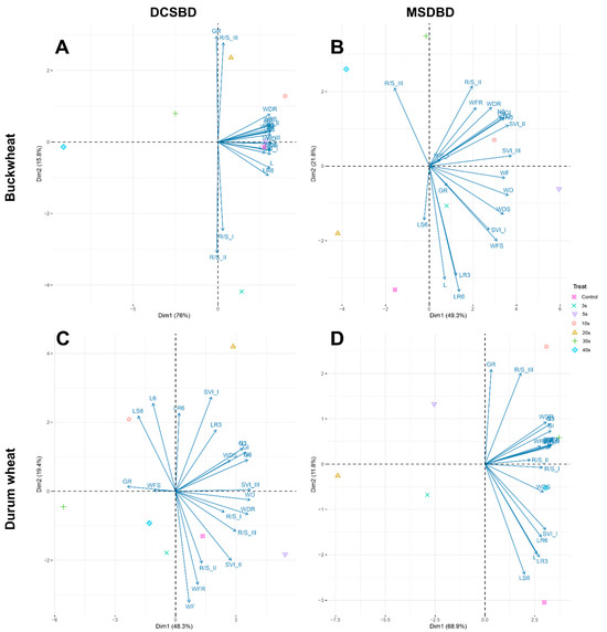 Plots of Principal Component Analysis (PCA) on measured characteristics in treated buckwheat and durum wheat by non-thermal plasma treatments (DCSBD and MSDBD) after various time expositions. Subfigures (A–D) correspond to individual combinations between NTP type and plant species. The abbreviations of the characteristics are explained in the 4.5. Germination and Early Growth.