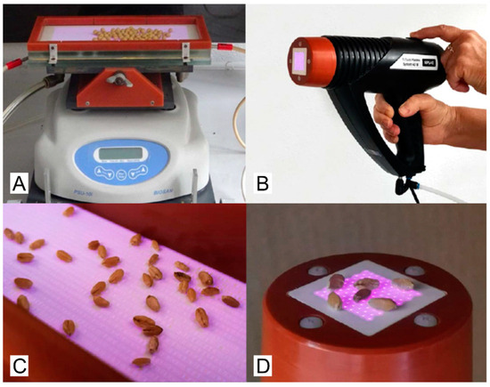 For the plasma treatment, we used and compared two types of plasma sources (DCSBD and MSDBD). The first one, DCSBD, has already been widely used and studied in regard to seed surface treatment [29,43,44], while MSDBD has only been used in a few studies so far [45,46]. Both plasma sources can use ambient air as the working gas (but they also work with other gases such as nitrogen, oxygen, and their mixtures). The main difference between the plasma sources used is that with the DCSBD plasma treatment, the seeds move in the active plasma zone, which has an effective thickness of 0.3 mm. In the case of MSDBD, the active plasma species flow through the holes to a longer distance, and the seeds are more homogenously surrounded by active particles. On the other hand, the DCSBD plasma source has a larger active plasma area (8 × 20) cm2, while MSDBD has an active area of (19 × 18) mm2. The advantage of the MSDBD is its portability.