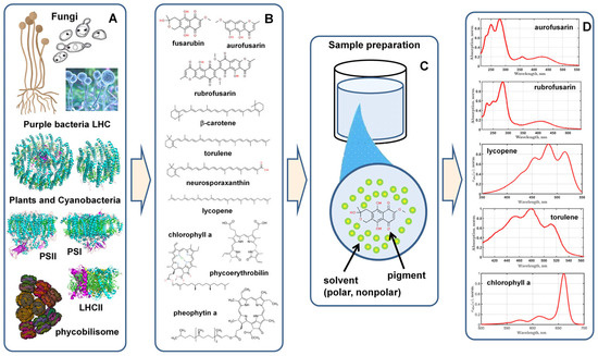 Most organic pigments are part of the pigment–protein complexes of bacteria, plants, and fungal hyphae [1] (Figure 1A). Since pigments mainly absorb and fluoresce in the visible range, there is a potential opportunity to develop a technique to detect a pigment in any substance using its optical response. Spectroscopy methods currently provide a whole arsenal of tools for studying the optical properties of pigment molecules [2]: absorption and fluorescence spectroscopy [3] in the infrared, visible, and UV ranges [4], as well as Raman spectroscopy [5]. However, to perform measurements on the studied pigments (Figure 1B), they have to be isolated from proteins and placed in a cuvette with buffer (Figure 1A,C). In vivo measurements can be taken using the laser remote sensing technique [6,7,8,9,10], but the interpretation of the obtained signal is difficult [11] since the pigments are directly in the living organism and their optical properties are differ from those of pigments in solvents.