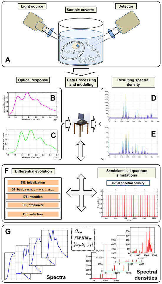 Graphic illustration explaining the main points of the methodology for the identification of pigments by their optical properties. Registration of the optical response includes a wide range of experimental techniques. (A) Absorption, Raman spectroscopy, remote sensing. Optical measurements (B,C), usually in the form of spectra; arrays of intensities and the corresponding frequencies at which they were measured are processed using multiparametric evolutionary optimization and procedures of spectra simulation within the framework of semiclassical quantum theory (F). The result of spectra processing is represented in the form of spectral densities (D,E), which are considered unique identifiers of pigments and their local environments as a system (coloring (D) and (E) represents the intensity of the peaks). These results are further compared and analyzed with accumulated data in a database (G) containing spectra and spectral densities for different pigments in reference solvents.