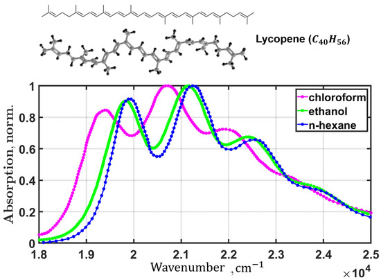 Any effects caused by the interaction of matter with an electromagnetic field can be assessed by measuring a material quantity such as polarization. To demonstrate the functioning of our method, we used the absorption spectra of lycopene measured at room temperature in three solvents: chloroform, ethanol, and n-hexane (Figure 3).