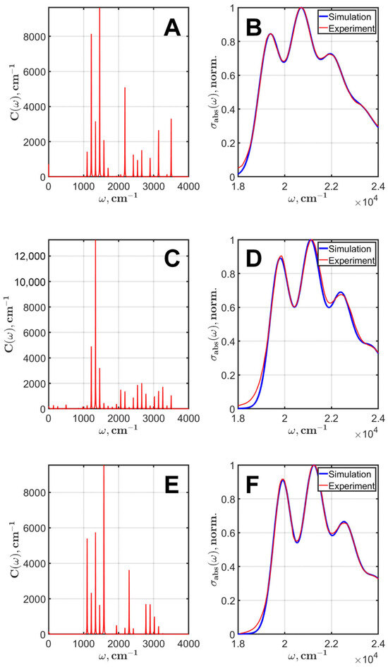 Results of the modeling of lycopene absorption spectra of the electronic transition (B,D,F). The corresponding spectral densities in chloroform, ethanol, and n-hexane at room temperature (A,C,E).