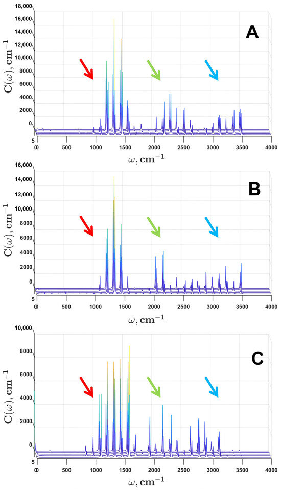 Spectral densities for lycopene in chloroform (A), ethanol (B), and n-hexane (C) obtained after five runs of optimization. Colored arrows indicate the range of , , , and vibronic modes (red) of carotenoids and their overtones (green, blue).