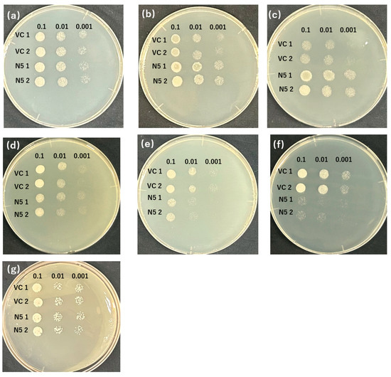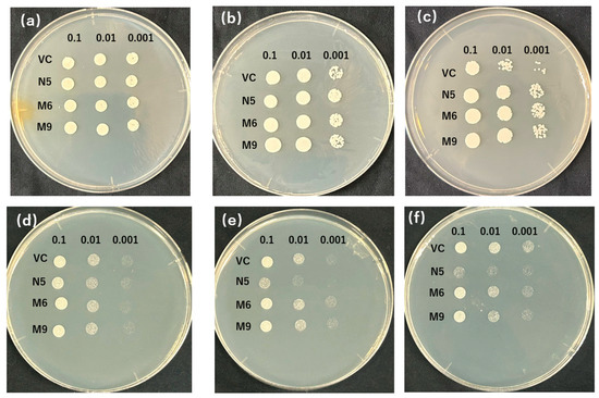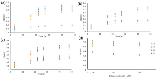In the growth test in liquid medium, the growth rates of M6 and M9 were compared with those of VC and N5. Under Mn-deficient conditions, M6 and M9 grew slightly slower than N5, but much faster than VC (Figure 4a). In the presence of Cd, the growth of N5 was suppressed, and the growth of the two mutants was similar to that of VC (Figure 4b). In the presence of Cd but not Mn, the growth rates of the two mutants were higher than those of VC and N5 (Figure 4c).