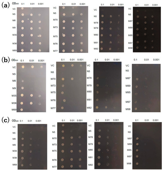 The appropriate conditions of screening were determined by analyzing the transportation of Cd and Mn by OsNRAMP5 in yeast because although when expressed in yeast, OsNRAMP5 functions as a transporter of both Mn and Cd, the growth of the yeast might also depend on the environmental concentrations of the metals [42,44]. In the absence of Mn with different concentrations of EGTA, the growth of the negative control (VC) was inhibited from 10 mM EGTA, and the effect was the most at 20 mM EGTA (Figure 1b,c), but no significant difference was found with 2 mM EGTA (Figure 1a); however, OsNRAMP5-expressing N5 showed good growth even with 20 mM EGTA as a result of transport of Mn by the OsNRAMP5 (Figure 1a–c). In the presence of different concentrations of Cd, the growth of N5 was impaired from 50 μM Cd, and the most significant difference was found at 100 μM Cd (Figure 1e,f), but the Cd concentration of 10 μM did not influence the growth of the yeast significantly (Figure 1d), and that of VC was unaffected regardless of Cd concentration (Figure 1d–e). Furthermore, both VC and N5 showed inhibited growth in a −Mn/+Cd environment compared with a +Cd environment and −Mn environment, respectively (Figure 1c,e,f,g), and no significant difference was found between the growth of VC and N5 in a −Mn/+Cd environment (Figure 1g). These results indicate that the difference in growth of VC and N5 could be clearly identified in the environment with 20 mM EGTA chelating Mn and 100 μM CdCl2, which demonstrates that the concentrations of EGTA and Cd were appropriate for the later screening.
