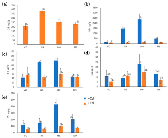 M6 showed similar Fe absorption to N5 in the absence of Cd, which was significantly higher than in the presence of Cd. However, M9 showed similar absorption of Fe to VC irrespective of the presence of Cd. Meanwhile, the absorption of Fe in both M9 and VC showed lower levels in the absence of Cd, but M6, M9, VC, and N5 showed similar levels of Fe absorption in the presence of Cd (Figure 5c). There was no significant difference in the absorption of Cu compared with M6, M9, VC, and N5, irrespective of the presence of Cd. Therefore, neither pattern 1 mutants nor the pattern 2 mutants showed an influence in the absorption of Cu. Moreover, M6, M9, VC, and N5 showed similar Zn absorption in the presence of Cd, although in the absence of Cd, only M6 showed elevated Zn absorption (Figure 5e).