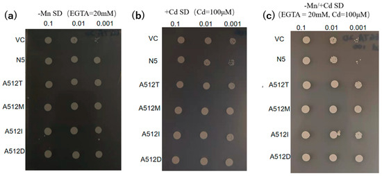 The plasmids pDR195 and pDR195 containing OsNRAMP5 were transformed into the Mn-absorbing transporter-deficient mutant yeast strain Δsmf1 (MATalpha, his3Δ1; leu2Δ0; meta15Δ0; ura3Δ0; YOL122c:; kanMX4), generating VC and N5, respectively. Metal transport assays were carried out in synthetic defined (SD) medium (2% glucose, 0.5% yeast nitrate base without amino acids, and 2% agar) containing Cd (10 μM, 50 μM, 100 μM CdCl2) but not Mn (2 mM, 10 mM, 20 mM EGTA, pH 5.9) in different concentrations [43,44]. The media were spotted with 8 µL of yeast suspension (OD600 = 0.1, 0.01, 0.001), incubated statically at 30 °C for 2 days, and the growth of the yeast strains was monitored.