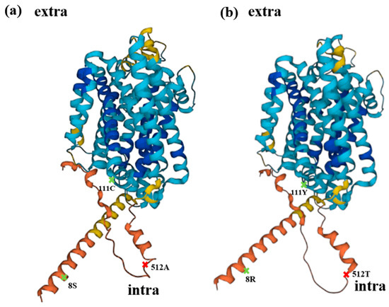 Structural prediction. (a) Schematic diagram of wild-type OsNRAMP5 produced with AlphaFold DB version, with alanine 512 (red), which is important for cadmium and manganese transport and affecting the absorption of zinc, and serine 8 and cysteine 111 (green), which influence metal absorption. (b) Schematic diagram of OsNRAMP5 with three mutations predicted with AlphaFold DB version, with potentially important locations indicated by the same color as (a).