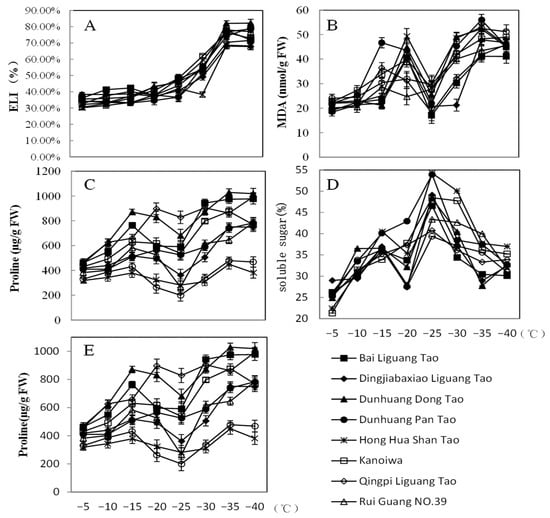 Parallel to this, as temperatures decreased, both soluble sugar and protein concentrations generally rose, with a decline observed at −30 °C. The peak levels of soluble sugar and protein were found in samples subjected to −25 °C, while the lowest levels were recorded at −5 °C and −35 °C, respectively. The proline concentration exhibited a distinctive pattern: an initial increase, followed by a subsequent decrease, and then another rise. Temperatures below −5 °C significantly stimulated the accumulation of proline. A notable increase in proline content was observed when the temperature dropped below −15 °C, which was subsequently followed by a significant decrease at −25 °C. Subsequently, there was a rapid increase in proline levels with further temperature decrease, reaching its peak at −35 °C. Dunhuang Dong Tao had the highest content of 1028.36 μg/g, while Hong Hua Shan Tao had a content of 449.73 μg/g (Figure 2C–E).