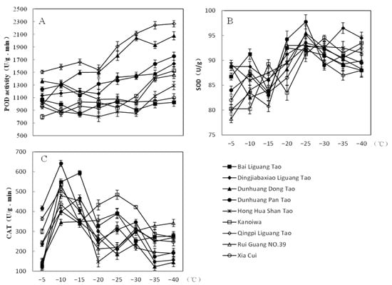 Changes in enzyme activity of 9 peach resources under varying LTs. (A): POD activity; (B): SOD activity; (C): CAT activity. Error bars denote standard errors.