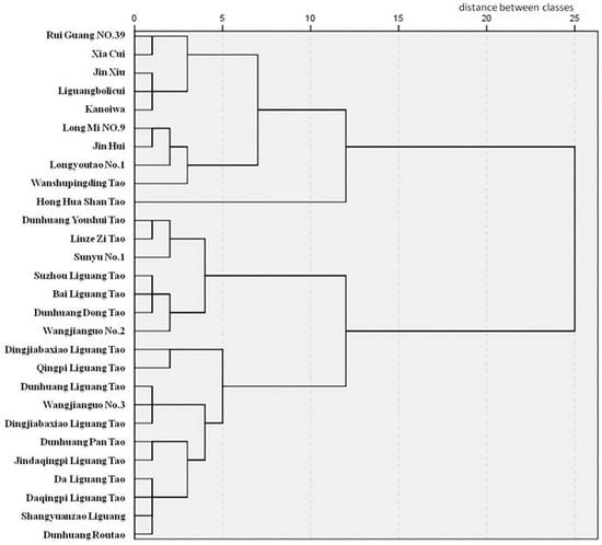 To gain insight into the cold resistance of peach resources, we analyzed 28 peach resources (varieties) subjected to a −25 °C treatment, employing six pivotal physiological and biochemical indices and two anatomical structural indices of branches linked to cold resistance. Each index’s membership function value was meticulously calculated, and the average membership function methodology was then applied to gauge the cold-resistance attributes of these resources. Upon computation, cold resistance was categorized into five distinct levels based on the membership function values, which ranged from 0.17 to 0.61 for the 28 peach resources (Table 8). Dingjiaba Liguang Tao stood out with an average membership value of 0.61, positioning it in the high-cold-resistance (HR) category; six peach germplasms fell under the cold-resistant (R) label with average membership scores between 0.50 and 0.52; eleven resources were designated as moderately cold-resistant (MR) with scores between 0.40 and 0.48; seven resources were identified with low cold resistance (LR), scoring between 0.30 and 0.38; and three resources, including Xiacui (which had the lowest mean membership function value at 0.17), were labeled as sensitive to cold (S). Regarding broader categorization (Figure 5), the 28 peach resources were segmented into two main clusters: Category I included sub-groups with resources like Rui Guang No. 39, Xia Cui, Jin Xiu, Liguangbolicui, Kanoiwa, Long Mi No. 9, Jin Hui, Longyoutao No. 1, and Wanshupingding Tao, all of which exhibited heightened sensitivity to cold temperatures, with Hong Hua Shan Tao uniquely positioned in its sub-group; Category II was further split into two subsets, with the first subset containing resources such as Dunhuang Youshui Tao, Linze Zi Tao, Sunyu No. 1, Suzhou Liguang Tao, Bai Liguang Tao, Dunhuang Dong Tao, and Wangjianguo No. 2 that demonstrated moderate cold resistance, and the second subset with resources like Dingjiabaxiao Liguang Tao, Qingpi Liguang Tao, Dunhuang Liguang Tao, and others known for marked cold resistance. Importantly, the insights from the average membership function largely aligned with the cluster analysis outcomes, emphasizing the robustness of these evaluation methods, with the only deviation being Hong Hua Shan Tao.