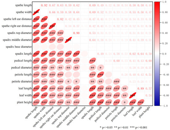 Correlation analysis was conducted among 15 traits (Figure 2). The results indicated that the length, comprising spadix-, pedicel-, and petiole-, were significantly positively correlated with their diameter. The spathe length was strongly positively correlated with its width (r2 = 0.92, p < 0.001), the distance of the left and right ear in spathe was strongly positively correlated (r2 = 0.82, p < 0.001), and the leaf length was strongly positively correlated with its width (r2 = 0.89, p < 0.001). While the plant height was positively correlated with the length of pedicel and petiole.