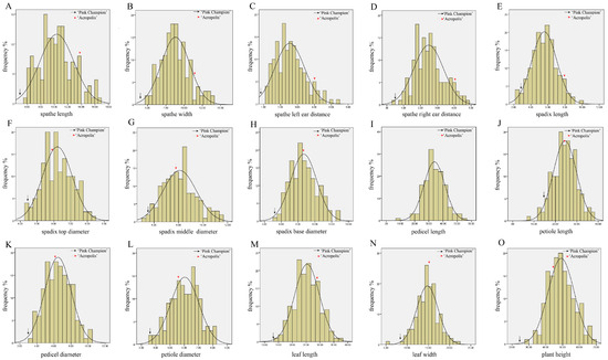 The distribution pattern for 15 traits measured in the mapping population. The subfigure (A–O) indicate the phenotypic variation of spathe-, spadix-, pedicel-, petiole-, leaf-, and height-related traits among the offspring, respectively. The normal distribution curve in the graph represented the expected percentage with respect to the measurement range of traits. The x-axis indicates the measurement values for each trait; the y-axis indicates frequency. The black and red arrows indicate the mean value of female and male parents, respectively.