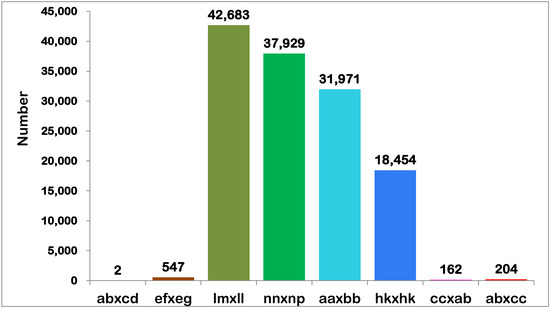 To genotype ‘Pink Champion’ (♀), ‘Acropolis’ (♂), and F1 progenies, SLAF-seq was performed and 188.37 Gb of raw data were obtained with a Q30 of 95.81% and GC content of 40.5%. The number of reads for the female and male parents was 9,869,344 and 11,383,208, and the mean for the F1 progeny was 5,790,723. The average sequencing depth was 80.65× for ‘Pink Champion’, 91.85× for ‘Acropolis’, and 31.68× for the F1 progeny (Table 2). Among these reads, 327,963 SNP markers were identified in all, of which 131,951 were successfully encoded and genotyped into eight segregation patterns (ab × cd, ef × eg, lm × ll, nn × np, aa × bb, hk × hk, cc × ab, ab × cc) (Figure 4). Filtered out 31,971 SNP markers were classified into the pattern of aa × bb (in the ratio of 24.23%), which is inapplicable to the CP model; the remaining 99,980 markers could be used for genetic map construction. To ensure a high-quality genetic map, low-quality SNP markers with integrity lower than 85%, parental information missing, and segregation separation p < 0.05 were removed. Finally, 10,648 SNP markers were identified for the genetic map construction.