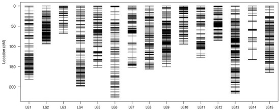 The modified logarithm of odds (MLOD) values were calculated between two SNP markers, and fewer than 10 were removed. A total of 8171 SNP markers (in the ratio of 76.48%) were ultimately retained for the high-density genetic map construction, which were distributed into 15 linkage groups (LGs). The total map distance of female and male parents was 2176.58 cM and 1940.36 cM, respectively. By integrating the parents’ genetic map, a linkage map with 2202.27 cM in length with an average distance of 0.30 cM was constructed (Figure 5 and Table 3). The largest linkage group was LG6 with a length of 226.98 cM which harbored 1082 markers, while the smallest linkage group was LG3 with 68.23 cM genetic distance containing 127 markers. The most saturated linkage group was LG12, which harbored 987 markers covering a length of 85.27 cM with the least average interval of 0.09 cM. The max gap on LG12 was only 4.46 cM, which is smaller than that of other linkage groups, while the largest genetic gap was found in LG14, with 23.88 cM genetic distance. The percentage of gap (<5 cM) was 98.40%, indicating that the markers were relatively well-distributed in the map [31]. According to a chi-square test (p < 0.05) of the 8171 SNP markers, 429 of which (with a ratio of 5.25%) were segregation distortion markers. The greatest number of segregation distortion markers were found in LG14, with a ratio of 33.83% (Table S1).
