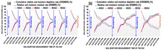 The volumetric soil moisture dynamics for 13 days (16–28 days after planting) for watering treatments imposed in short-term water-stressed (W2) and long-term water-stressed (W3) treatments are presented in Figure 1a,b, respectively. In the case of W2 pots, the cumulative relative soil moisture depletion rate (CRSMDR) was relatively higher and vice versa, the relative soil moisture residual rate (RSMRR) was lower under G2 during the first five days, and afterward, it was changed, and the said trend was observed under G1 up to 13 days. After 13 days of watering treatment in W2, the CRSMDR was 4.84% and 16.69% higher and the RSMRR was 5.66% and 19.61% lower in G1 compared to G2 and G3, respectively. In W3 pots, the CRSMDR and the RSMRR were more acute than W2. During the first five days, the CRSMDR trend was higher and the RSMRR trend was lower in G3, but afterward, up to 13 days, higher CRSMDR and lower RSMRR were found in G1. After 13 days of watering treatment in W3, the CRSMDR was 3.66% and 7.87% higher and the RSMRR was 12.33% and 26.87% lower in G1 compared to G2 and G3, respectively.