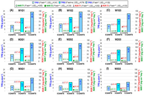 Interaction effect of water levels and genotypes on TPB (total plant biomass), RGR-T (relative growth rate based on total plant biomass), and NAR-T (net assimilation rate based on total plant biomass). (A–I) represent the interaction treatments W1G1, W1G2, W1G3, W2G1, W2G2, W2G3, W3G1, W3G2, and W3G3, respectively. DAWTS: days after watering treatments started; 1, 2, and 3 stage: 5, 9, and 13 DAWTS; V6: vegetative 6-leaves stage; V10: vegetative 10-leaves stage; VT: vegetative tasseling stage; W1: watering every day; W2: 2 days of watering interval; W3: 4 days of watering interval; G1: Suwan 2301, G2: Suwan 4452, and G3: S 7328; * and **: significant at p < 0.05 and p < 0.01 levels, respectively; ns: nonsignificant.