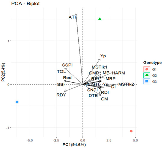 The biplot diagram of principal component analysis (PCA) of three genotypes of maize according to mean measured drought tolerance indices together with mean total plant biomass under long-term water stress (Ys) and well-watered (Yp) situations. MP, mean productivity; MRP, mean relative performance; SSI, stress susceptibility index; TOL, tolerance index; GMP, geometric mean productivity; REI, relative efficiency index; STI, stress tolerance index; MSTIk1, modified stress tolerance index 1; MSTIk2, modified stress tolerance index 2; HARM, harmonic mean of yield; YI, yield index; Red, reduction; RDI, relative drought index; DI, drought resistance index; GM, golden mean; ATI, abiotic tolerance index; SSPI, stress susceptibility percentage index; SNPI, stress/non-stress production index; RDY, relative decrease in yield; DTE, drought tolerance efficiency; G1, Suwan 2301; G2, Suwan 4452; G3, S 7328.