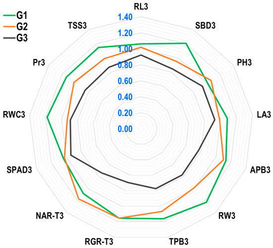 The radar plot results (Figure 4) showed that the genotype Suwan 2301 (G1) has excellent drought tolerance due to a high YI for traits SBD3, LA3, APB3, RW3, TPB3, RGR3, SPAD3, RWC3, Pr3, TSS3, and RL3. Despite the fact that the YI value for NAR-T3 in G1 was moderate, it was greater than one, which is significant and acceptable. In G1, the YI value for PH3 was lower than in G2. Suwan 4452 had comparatively high YI values for PH3 and NAR-T3, whereas SPAD3 and RGR-T3 were less affected by water stress, with lower YI values than Suwan 2301. The genotype S 7328 (G3) had the lowest Yi values for all traits, with values less than one for RL3, SBD3, PH3, LA3, APB3, RW3, TPB3, RGR3, NAR-T3, SPAD3, RWC3, Pr3, and TSS3. Suwan 2301, therefore, demonstrated a higher tolerance to water stress by showing significant and high YI values in RW3 (1.23), SBD3 (1.21), RWC3 (1.18), TPB3 (1.16), RGR-T3 (1.15), TSS3 (1.15), Pr3 (1.13), APB3 (1.13), NAR-T3 (1.08), RL3 (1.06), and SPAD3 (1.04), which may be desirable traits for field-level maize production under rainfed conditions.