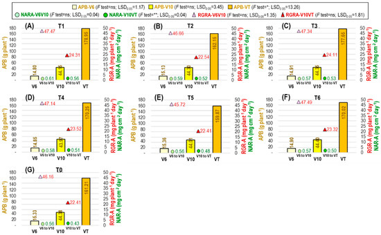Effect of ethephon tactics on APB (aboveground plant biomass) and RGR-A (relative growth rate based on aboveground plant biomass). (A–G) represent the ethephon treatments T1 (ethephon@ 281 at V6 stage), T2 (ethephon@ 281 at V6 + 281 at V10 stage), T3 (ethephon@ 281 at V10 stage), T4 (ethephon@ 562 at V6 stage), T5 (ethephon@ 562 at V6 + 562 at V10 stage), T6 (ethephon@ 562 at V10 stage), and T0 (no ethephon application), respectively. V6: vegetative 6-leaves stage; V10: vegetative 10-leaves stage; VT: vegetative tasseling stage; * and **: significant at p < 0.05 and p < 0.01 levels, respectively; ns: nonsignificant.