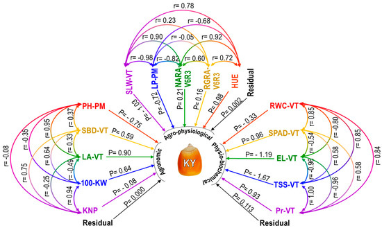 Path diagram showing the relationships between several agronomic (left side), agro-physiological (upper side), and physio-biochemical (right side) characteristics of maize under rainfed conditions at the field level. The direct impact (P) on kernel yield (KY) is indicated by a single arrow, while the correlation coefficient (r) between attributes is indicated by a double arrow. V6, vegetative 6-leaves stage; VT, vegetative tasseling stage; R3, reproductive phase 3 of maize plant; PM, physiological maturity stage; KNP, kernel number per plant; 100-KW, 100-kernel weight; LA-VT, leaf area at VT; SBD-VT, stem base diameter at VT; PH-PM, plant height at PM; SLW-VT, specific leaf weight at VT; LP-PM, lodging percentage at PM; NARA-V6R3, net assimilation rate based on aboveground plant biomass during V6 to R3; RGRA-V6R3, relative growth rate based on aboveground plant biomass during V6 to R3; HUE, heat use efficiency; RWC-VT, relative water content at VT; SPAD-VT, SPAD value of leaf greenness at VT; EL-VT, electrolyte leakage at VT; TSS-VT, total soluble sugar at VT; Pr-VT, proline content at VT.