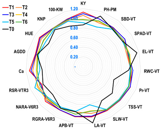 Radar plot showing yield index (YI) of 19 characteristics of maize grown under rainfed conditions. The numbers shown in blue in the graphic indicate the whole YI scale. T1: ethephon @ 281 g at V6 stage; T2: ethephon @ 281 g at V6 + 281 g at V10 stage; T3: ethephon @ 281 g at V10 stage; T4: ethephon @ 562 g at V6 stage; T5: ethephon @ 562 g at V6 + 562 g at V10 stage; T6: ethephon @ 562 g at V10 stage; T0: no ethephon application. V6: vegetative 6-leaves stage; VT: vegetative tasseling stage; R3: reproductive phase 3; PM: physiological maturity stage; PH-PM: plant height at PM; SBD-VT: stem base diameter at VT; SPAD-VT: SPAD value of leaf greenness at VT; EL-VT: electrolyte leakage at VT; RWC-VT: relative water content at VT; Pr-VT: proline content at VT; TSS-VT: total soluble sugar at VT; SLW-VT: specific leaf weight at VT; LA-VT: leaf area at VT; APB-VT: aboveground plant biomass at VT; RGRA-V6R3: relative growth rate based on aboveground plant biomass during V6 to R3; NARA-V6R3: net assimilation rate based on aboveground plant biomass during V6 to R3; RSR-VTR3: relative senescence rate during VT to R3; Ca: carbon absorption; AGDDs: accumulated growing degree days; HUE: heat use efficiency; KNP: kernel number per plant; 100-KW: 100-kernel weight; KY: kernel yield.
