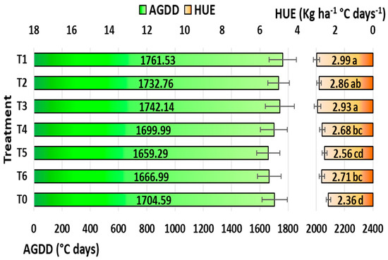 Accumulated growing degree days (AGDDs) on left side and heat use efficiency (HUE) on right side of the graphic as affected by ethephon application tactics in maize under rainfed conditions in the tropics. T1: ethephon @ 281 at V6 stage; T2: ethephon @ 281 at V6 + 281 at V10 stage; T3: ethephon @ 281 at V10 stage; T4: ethephon @ 562 at V6 stage; T5: ethephon @ 562 at V6 + 562 at V10 stage; T6: ethephon @ 562 at V10 stage; T0: no ethephon application. Means within a chart with the same or no letters are not significant at p < 0.05 based on LSD test. Horizontal bars are twice the standard deviation.