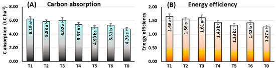Carbon absorption (A) and energy efficiency (B) in maize grown under rainfed conditions. T1: ethephon @ 281 at V6 stage; T2: ethephon @ 281 at V6 + 281 at V10 stage; T3: ethephon @ 281 at V10 stage; T4: ethephon @ 562 at V6 stage; T5: ethephon @ 562 at V6 + 562 at V10 stage; T6: ethephon @ 562 at V10 stage; T0: no ethephon application. Means within a chart with the same or no letters are not significant at p < 0.05 based on LSD test. Vertical bars are twice the standard deviation.