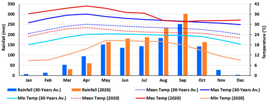 The long-term data showed that climate change impacted the weather of Nakhon Ratchasima province of Thailand (Figure 5 and Figure S1). The mean annual temperature is on an increasing trend, and it has increased by about 0.8 °C per decade since the 1950s. The annual rainfall range is 893.36 mm to 1603.81 mm from 1901 to 2021, where the maximum rainfall occurred in 2017 and the minimum occurred in 1979. It was found that December and January are relatively cool, and March to May are relatively the hottest. On the other hand, the long-term data indicated that the mean temperature in January 2020 was approximately 25 °C, whereas the current data indicated that it was approximately 23 °C (Figure 5). However, the warmer months continued to get hotter, and it was discovered that the maximum temperature in April 2020 was approximately 41 °C, although long-term statistics indicated that it was approximately 36 °C. When it came to rainfall, the long-term data indicated that the highest amounts happened in September followed by August, while the lowest amounts were in January and December. In contrast, the current data revealed that there was no rainfall in January, February, November, and December.