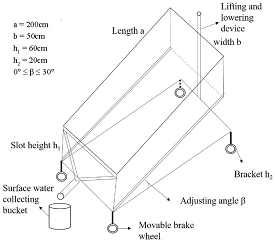 In this research, an experiment was performed from May to September 2022 at the simulation test base of the Beijing Academy of Agricultural and Forestry Sciences in Haidian District, Beijing, China. The rainfall equipment was the QYJY-502 portable automatic artificial simulation rainfall system (mainly composed of rainfall nozzles, water supply pipelines, pressure gauges, return valves, water supply pumps, stainless steel brackets, on–off valves, etc.) developed by Xi’an Qingyuan Measurement and Control Technology Co., Ltd., with a rainfall height of 5 m, a rainfall uniformity coefficient of over 80%, and a continuous variation range of rainfall intensity of 15–120 mm/h. Runoff plots (length × width × height = 200 cm × 50 cm × 60 cm) (Figure 1), three-dimensional simulated soil plots composed of welded steel plates, were automatically designed by QYJY-502 according to its effective rainfall area with a variable slope that could be flexibly adjusted in the range of 0–30°. The runoff slots were placed in parallel and covered with the same rainfall intensity for repeated calculation. After that, slope runoff and sediment were collected through the triangular outlet at the top of the runoff slots.