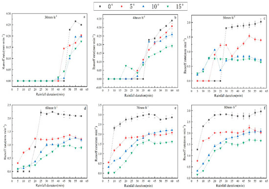 Runoff rate as a function of time under different treatments (slope gradient and rainfall intensity). The error bars refer to the standard deviation. Runoff rate as a function of time under 30 mm·h−1 (a). Runoff rate as a function of time under 40 mm·h−1 (b). Runoff rate as a function of time under 50 mm·h−1 (c). Runoff rate as a function of time under 60 mm·h−1 (d). Runoff rate as a function of time under 70 mm·h−1 (e). Runoff rate as a function of time under 70 mm·h−1 (f).