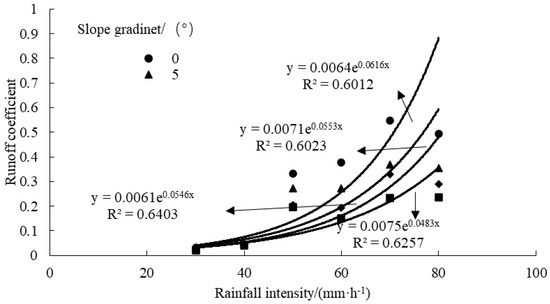 Based on the data in Table 1, the runoff coefficient (cumulative runoff/cumulative rainfall) was calculated, and the dynamic characteristic curve of the runoff coefficient changing with the rainfall intensity and slope gradient was plotted (Figure 3). As revealed by Figure 3, the variation of the runoff coefficient showed an exponential correlation with the rainfall intensity, displaying a correlation coefficient of >0.78, and as the rainfall intensity became higher, the range of the runoff coefficient was increased. The runoff coefficient was the largest under the slope gradient of 10°, showing the closest correlation. According to the variation law of runoff coefficient under six rainfall intensities, in the case of the rainfall intensity <40 mm/h, the variation of runoff coefficient with the slope gradient was not noticeable, but in the case of the rainfall intensity >40 mm/h, the increased range of the runoff coefficient doubled, and the increase was the fastest under 0° among the four slope gradients.
