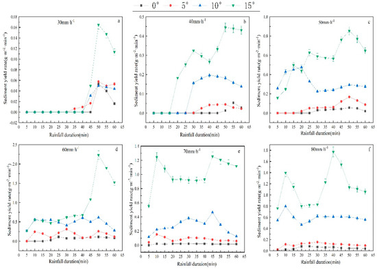 Sediment yield rate as a function of time under different treatments (slope gradient and rainfall intensity). The error bars refer to the standard deviation. Sediment yield rate as a function of time under 30 mm·h−1 (a). Sediment yield rate as a function of time under 40 mm·h−1 (b). Sediment yield rate as a function of time under 50 mm·h−1 (c). Sediment yield rate as a function of time under 60 mm·h−1 (d). Sediment yield rate as a function of time under 70 mm·h−1 (e). Sediment yield rate as a function of time under 70 mm·h−1 (f).
