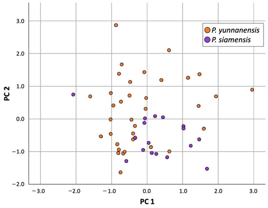 Principal Component Analysis results (PC1, PC2) of P. yunnanensis and P. siamensis in the flowering state.