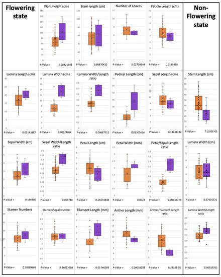 The results from t-tests showed that these two species are different with respect to several characteristics in both the flowering and non-flowering stages (Figure 8). In the flowering stage, lamina width, lamina width/length ratio, sepal width/length ratio, etc., were significantly different between the two species. In the non-flowering stage, the lamina width/length ratio and stem length were also significantly different.