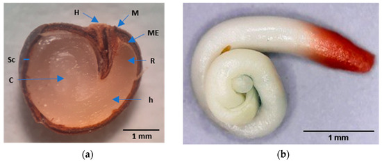 Caper seed. (a) Longitudinal section of a mature caper seed after soaking in water for four days. H, hilum; M, micropyle; ME, micropylar endosperm; R, radicle; h, hypocotyl; Sc, seed coat; and C, cotyledons; (b) Embryo with a stained radicle with tetrazolium.