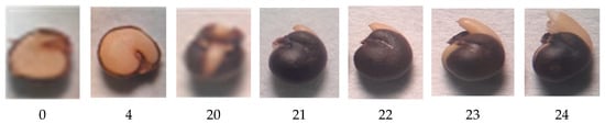 From left to right, photographs correspond to the number of days elapsed since the start of the germination test (Day 0; dry mature seed) through to the opening of the testa (Day 20) and elongation of the hypocotyl and radicle inside the endosperm (from Day 20 to 23), until the rupture of the micropylar endosperm (Day 24). On Days 0 and 4, half of the testa was removed to observe the state of the endosperm.