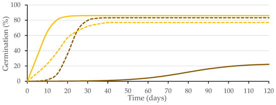 Logistic model adjusted to the germination curves made for seeds with intact testa (brown) and without testa (yellow) with substrate wetted with water (solid line) or GA3 solution (500 mg L−1; dashed line). Average values of four replicates.