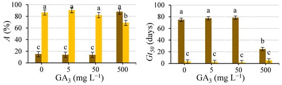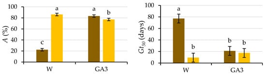 Analysis of the significant interactions of the analysis of variance in Table 2 between the presence of the testa (with testa (brown) and without testa (yellow)) and the concentration of the GA3 solution used to wet the substrate (0, 5, 50 and 500 mg L−1) on A and Gt50. Average values of four replicates. Different letters indicate significant differences according to the LSD test. Error bars represent the LSD (p ≤ 0.05).