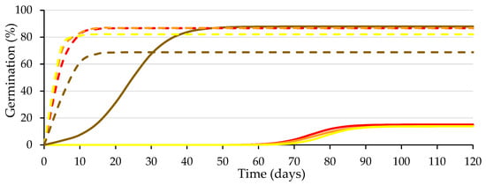 Logistic model adjusted to the germination curves of the seeds with (solid lines) and without testa (dashed lines) with substrate wetted with different GA3 concentration solutions (0, 5, 50 and 500 mg L−1 in red, orange, yellow and brown, respectively). Average values of four replicates.