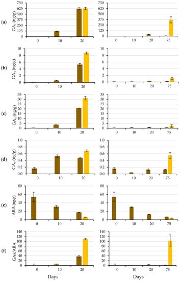 GA1 (a), GA3 (b), GA4 (c), GA7 (d) and ABA (e) contents and the GAs/ABA ratio (f) at 0, 10, 20 and 75 (if applicable) days after of the start of the germination test, using a GA3 (500 mg L−1) solution (left) or water (right) to wet the substrate. Day 20 (75) corresponds to the protrusion of the radicle of the seeds wetted with GA3 (water). Non-germinated seeds in brown, and germinated seeds in yellow. Mean values ± SE of 40 seeds (two replicates of 20 seeds).