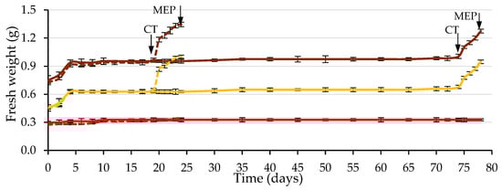 Time course of fresh weight (water uptake) during the germination test of caper seeds, considering seeds with testa (brown), the testa (red) and the endosperm containing the embryo (yellow). Seeds wetted with water are shown as solid lines, and those wetted with the 500 mg L−1 GA3 solution are shown as dashed lines (up to Day 19, solid and dashed lines practically overlap). The arrows indicate the dates on which the cracking of the testa (CT) and the piercing of the micropylar endosperm (MEP) occurred. Average values of four replicates of 10 seeds each. Vertical bars represent the standard error.